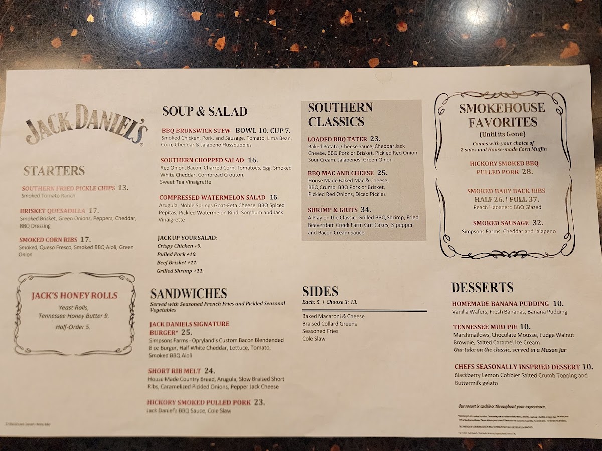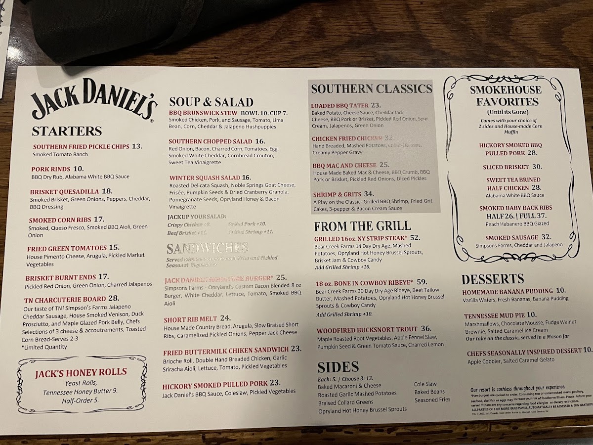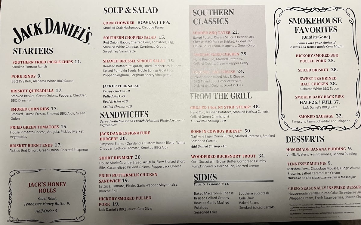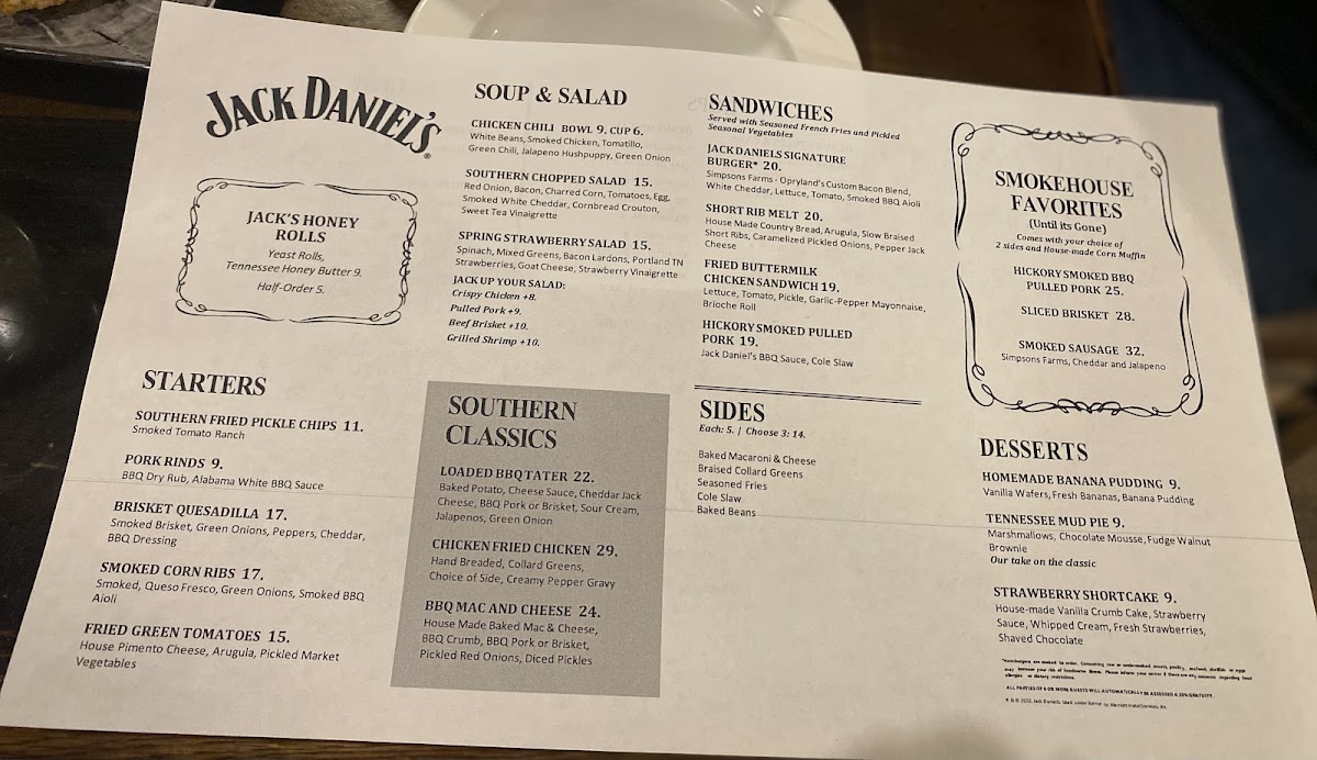 While some have noted that portion sizes can be generous, the combination of pulled pork, savory mac-n-cheese, and delightful honey rolls create a symphony of tastes that resonate with traditional Southern fare. Guests often commend the welcoming atmosphere and exceptional service, particularly highlighting attentive staff like Tyler. Although prices may skew higher, the overall experience is deemed worthwhile. For an unforgettable meal that captures the heart of Tennessee, Jack Daniel's is a destination not to be missed.